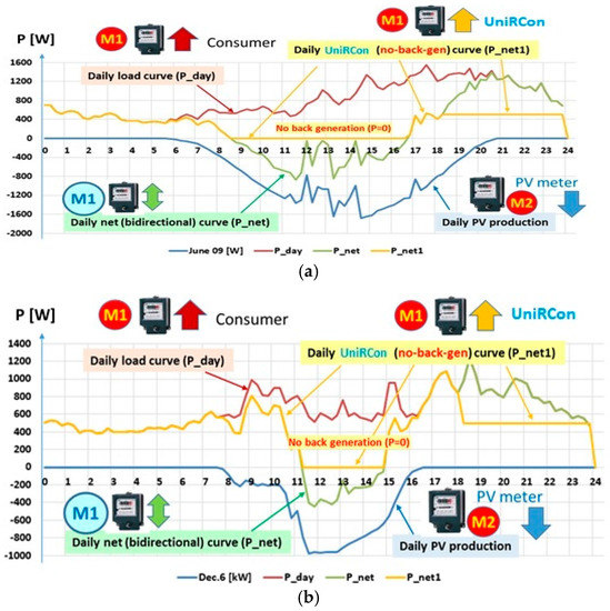 Figure 6 shows the load curve of a typical household in SE Europe with a total of 19.5 kWh daily consumption (P_day) in summer (Figure 6a is the average in summer period) and 15.8 kWh daily consumption in winter (Figure 6b is the average for winter period, superimposed over the daily PV generated energy curve of 2 kWp PV-units, during two selected days from Figure 5: June 2016, Romania, in Figure 6a; and December 2016, Romania, in Figure 6b). Note that the summer typical consumption (19.5 kWh) was higher than the winter typical consumption (15.8 kWh), due to refrigerators and moderate air-conditioner use, even if during wintertime there is more use of lighting. The studied cases do not include electrical energy use for heating, such as gas heating, that is available. This can be considered a typical situation for southern Europe, and especially for SE Europe. Figure 6 shows also the daily net power exchanged with the distribution network ( and ) in each typical day of summer and winter, for two different situations: