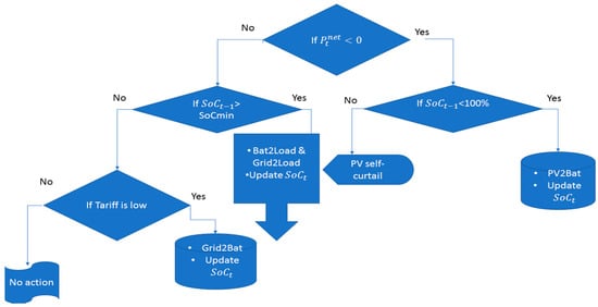- A bottom-up approach is used, with a decision-logic subroutine for the daily scheduling of the battery (time of charge and discharge and amount of energy to be charged/discharged). This scheduling module is based on estimated average from past recorded data for PV and load demand. Thus, it is implemented as a deterministic model with perfect knowledge information. Note, however, that this approach does not affect the economic/technical calculations below. They indeed may influence a real-time operation of the system. The decision logic used for scheduling the battery is give in Figure 7.