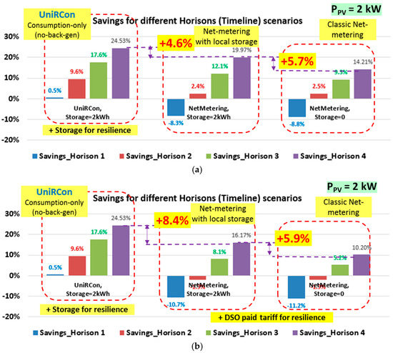 Figure 8 presents the results from the example considered, showing the cost savings from each of the use-cases for all four timelines. Figure 8a is a simplified comparison among the costs of investment and energy costs in three use-cases and four horizons. The “negative savings” show that on a total-life basis (in Line 13 of the table above we selected 15 years), the investments are not covered during this time period and bring, in fact, losses (energy cost savings are lower than investment and operational costs). The positive values show that the simplified calculation demonstrates savings in energy use (energy-cost savings are higher than investment and operational costs). In the figure, in the model with no subsidies, only the UniRCon solution does not bring negative results in the 2018 horizon. The classic net-metering with or without storage suggests the need for subsidies if the investment is made in horizon 1 (2018, bars in blue) and only the Table 4 conditions of horizons 2 to 4 (2020, 2022, 2015, bars in red, green and magenta) give savings in the investment.