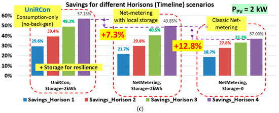 The comparison of savings between the use-cases is presented in Figure 8c. A small increase of price is considered over the four horizons, from $0.19 to $0.22 /kWh and also the FiT decreases from $0.04 to zero /kWh till 2025 (no back-generation is encouraged). It can be seen that the savings are high in any situation, due to the gap between the energy and feed-in tariffs, but also due to the fact that there is good PV production over the whole year. However, there is still a big difference between net metering and storage behind the meter (12.8% in the studied case) and there are still additional savings with the UniRCon solution versus storage behind the meter (7.3% more savings for UniRCon).