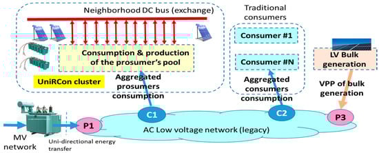 Figure 10 extends the view into the neighbourhood and shows the exchange between neighbours as resilient prosumers or consumers. Figure 11 shows the UniRCon cluster obtained by aggregating all UniRCons with an equivalent consumption C1—without any generator connected to the grid—and all the other consumers can be aggregated in C2. With adequate implementation, the UniRCon equivalent can be introduced, allowing a significant reduction of model complexity which further enables improvement of grid operation and appropriate plans for increasing resilience.