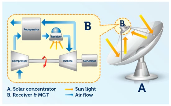 A Dish-MGT system consists of a paraboloidal concentrator, a High-Temperature (HT) solar receiver, and a recuperated MGT connected with a generator, as shown in Figure 1. The solar receiver absorbs the concentrated solar radiation and heats the compressed air coming from the recuperator.