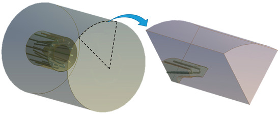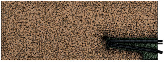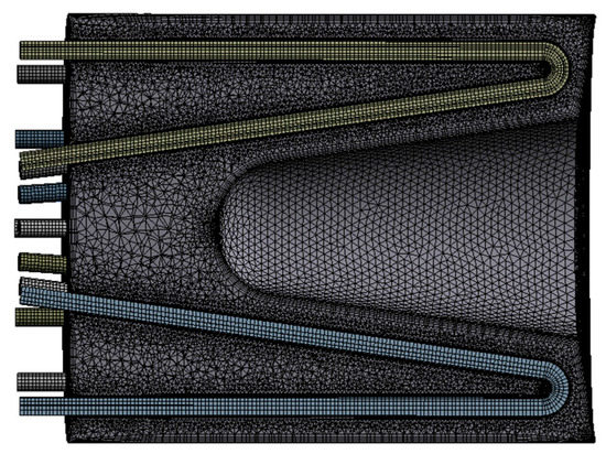 In order to have an appropriate mesh size for an accurate solution, the grid was refined until heat transfer became mesh independent. For the grid independency, the symmetry of the receiver geometry was considered and only a section containing two tubes was taken into consideration. The domain is shown in Figure 3. The grid-independent solution was evaluated by gradually refining the mesh. Table 4 highlights average receiver hot wall temperature, WF outlet temperature, and PCM liquid fraction for four computational grids, respectively. Grid 3 was taken into consideration to create the mesh for the complete receiver geometry. The overall final grid resolution had 1,367,211 nodes and 5,347,060 cells, as described in Table 5. Figure 4 and Figure 5 show the receiver cross-section and a detail of the external domain mesh, coarser far from the receiver structure and refined near the device surface, respectively. In the case of the WF domain, hexahedral cells were assigned while tetrahedral cells were used for both the PCM domain inside the receiver tank and the outer domain. Relevant boundary conditions are: