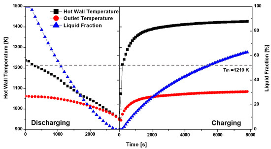 Figure 6 shows the variation of the average receiver hot wall temperature, the WF temperature at the outlet section, and the variation of the PCM liquid fraction during storage charging and discharging phases. During the discharge process, the hot wall temperature decreased gradually. The PCM was completely solidified after 48 min. The charging phase started after the complete solidification of the PCM. At the beginning of the charging process, a sharp increase in the hot wall temperature could be detected. Such an increase was due to the absorption of the concentrated solar radiation. Once the re-radiation effects started to balance the inlet solar power and the thermal power absorption in the receiver structure, the rate of increase of the hot wall temperature decreased rapidly. The PCM melting process increased gradually during the storage charge phase. After 130 min, a liquid fraction of 63% was detected.