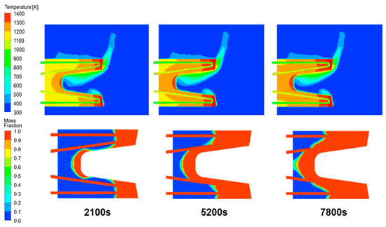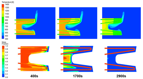 Details related to the discharging process are reported in Figure 7. The process started with the PCM completely melted inside the receiver container. Temperature profiles and PCM liquid fraction are shown for three time-steps: 400, 1700, and 2900 s from the process beginning. It is possible to see that the system grew cold starting from the front surface. In the meantime, the PCM started to solidify (400 s). The WF flowing inside the tubes continued to absorb heat from the PCM and a “mushy region” was generated near the tube walls. The solidification process continued from the aperture wall and the PCM solid portion grew, moving from the hot wall to the inner part or the receiver. After about 1000 s, a thick layer of solid PCM began to form around the WF tubes. The bottom wall of the cavity was at a slightly high temperature and the PCM near it remained in the liquid region. After about 2100 s, most of the PCM was solid. The solidification process was completed after 2900 s.