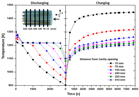 During the simulations, the temperature and liquid fraction of the entire PCM volume were monitored in six different sections along the receiver container axis. The distances were taken from the cavity opening on the front surface of the solar receiver. Figure 9 illustrates temperature profiles of the system for these six sections during discharge and charge processes. Since the lateral surface of the container is considered perfectly insulated, the heat transfer takes place between the hot wall and the PCM inside the container and between the PCM and the WF that flows inside tubes.