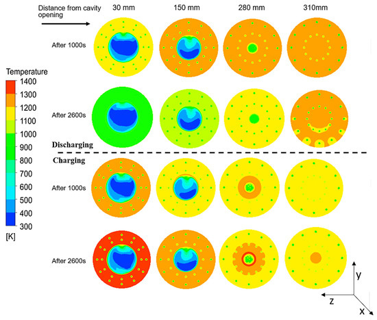 Temperature contours of several sections taken along the solar receiver axis during charging and discharging phases. Distance are taken from the cavity opening.