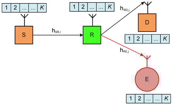 Let denote a set of subcarriers within the available bandwidth. The channel coefficient of the SR link on the ith subcarrier, , is denoted by , and that of the RD link on the jth subcarrier, , is expressed as . Further, the channel coefficient for the relay-to-eavesdropper (RE) link on the jth subcarrier is given by .