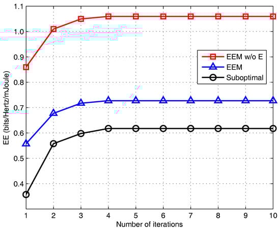 Convergence behavior of the proposed algorithms. EE: energy efficiency; EEM w/o E: EEM algorithm without an eavesdropper.