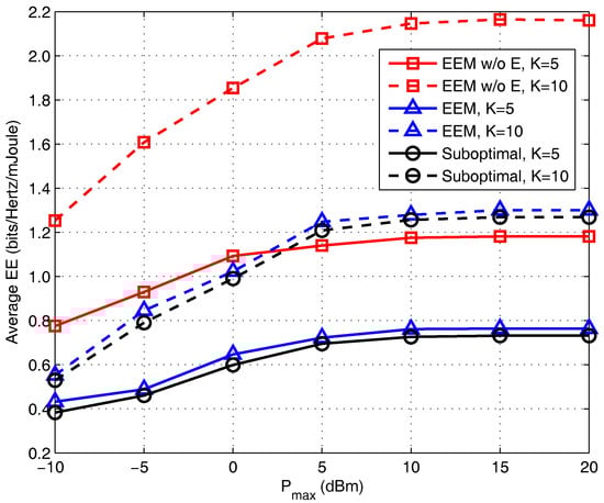 Figure 2 illustrates the convergence behavior of the designed algorithms for a single channel realization with , m, m, and dBm. It can be observed that the EE performance of the proposed algorithms and also EEM w/o E increases monotonically with the number of iterations, and the iterative algorithms converge within five iterations.