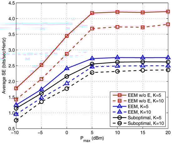 Figure 3 and Figure 4 show the average EE and SE performance of different algorithms and illustrate the impact of K on the EE and SE performance for , m, and m. It can be observed in Figure 3 and Figure 4 that the average EE and SE performance of the algorithms increases significantly as increases, and it remains constant after dBm. Furthermore, when K is increased from 5 to 10, the average EE is rapidly enhanced because of the better utilization of the available power budget and frequency diversity, while SE decreases due to the increase of the static power consumption. In general, we can observe that when the eavesdropper is active, the performance of the proposed algorithms is worse than that of the EEM w/o E.