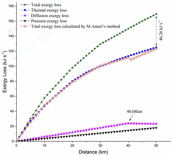 4.2. Analysis of Exergy Loss in the Process of Pipeline Transportation