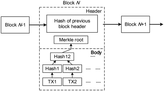 Blockchain is composed of a string of data blocks that is generated based on cryptography theory []. Blockchain is essentially a distributed ledger that can efficiently record transactions between two parties in a verifiable and permanent way. The structure of blockchain is shown in Figure 1. Each block consists of a header and a body. Most functions of blockchain are realized by the block header. The block header contains the hash of the previous block. This hash is calculated from the hash function of the previous block header. Blocks are connected successively by hash, which form the blockchain. The block body records all transaction information in the previous period. Each transaction (TX) generates a hash value, and then two adjacent hash values continue to implement hash algorithm to generate a unique Merkle root. The binary tree that is obtained through the above process is called Merkle tree []. The block body and the block header are connected by Merkle root. Any changes in the transaction information in the block will change the Merkle root value.