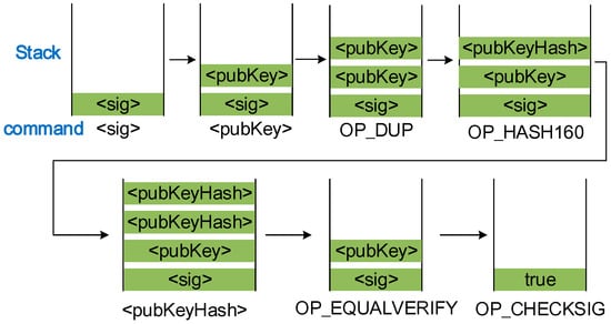 Script execution in the blockchain is based on stack language. It is calculated by data and work code commands. The data command pushes data onto the top of stack, whereas the work code command generally uses the data at the top stack as the input value to calculate one function. In this script, the input script command and <pubKeyHash> command in the output script are data commands, whereas the rest of the output script commands pertain to work code commands. The script execution process is shown in Figure 2.