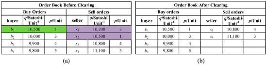 In the CDA market, the highest quote of a buyer is called the outstanding bid, and the lowest quote of a seller is called the outstanding ask. Transaction occurs when the outstanding bid is equal to or lesser than the outstanding ask. During the matching process, the outstanding bid is matched with the outstanding ask, and the transaction price is the average of their quotes. This matching process continues until the outstanding bid is lower than the outstanding ask. This process is called one round of transaction []. At least one transaction occurs in each round of transaction. For example, Figure 3a,b is the order books of the microgrid market before and after the clearing, respectively. In this matching round, the quote of buyer b1 (outstanding bid) is higher than that of seller s1. Thus, buyer b1 and seller s1 match successfully, and the transaction price and volume are 10,350 Satoshi/Unit and 3 Unit (Satoshi is the unit of bitcoin, and Unit is the transaction unit). Then, buyer b1 continues to match with seller s2 until the transaction price and volume are 10,500 Satoshi/Unit and 1 Unit, given that the quote of buyer b1 is equal to the price of s2. This round of transaction ends because the outstanding bid is less than the outstanding ask. Subsequently, the system updates the order book, as shown in Figure 3b. In the transaction process, market participants can examine the outstanding bid, outstanding ask, and transaction cost. They can adjust the quotes continuously according to market information and then match with each other again. If the buyer and the seller have not completed the matching before the trade deadline, they will purchase or sell electricity from the bulk power grid at a fixed transaction price rather than the market bid.