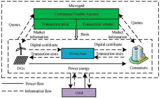 Centralized coal power or natural gas power generation have been the leading power supply modes for a long time. The massive use of fossil fuels not only causes numerous environmental problems, but also accelerates the exhaustion of fossil fuel resources []. Renewable energy sources, such as wind power, photovoltaic power, and hydropower, provide several possible solutions to environmental energy challenges []. The World Energy Council predicted that the power generation capacity from renewable energy sources would account for nearly 60% by 2060 []. Compared with traditional centralized power generation, renewable energy generations, which can produce electricity in small scale, are located on the load side and are connected to the grid in a distributed form []. Considering the change of generation structure, the electricity market will have to accommodate a large number of small-scale renewable energy suppliers. However, consumers can only trade with renewable energy source suppliers indirectly through their retailers in the existing electricity market [,]. Microgrids, which are defined as a small power distribution systems consisting of loads, distributed generations (DGs), and energy storage devices, are considered an efficient way to utilize renewable energy sources []. The direct transaction between DGs and consumers in microgrids rather than involving the retailer as the intermediate agency can increase benefits to both parties, and it is conducive for the development of renewable energy sources []. The key question of microgrid transactions is the safe, low cost, and transparent design of the information symmetry trade mode []. Traditional transaction management based on centralized organization in microgrids will experience the following problems: (1) the operation and regulatory costs of the transaction center are high, and these costs will be directly transferred to DG suppliers; (2) trust issue exists between the transaction center and traders, and the transaction center experiences difficulty in ensuring fairness, transparency, and effectiveness of information; and (3) information security risks exist in the centralized trading mode, which threaten transaction security and interests of traders [,,]. Therefore, new technologies should be developed for microgrid electricity transactions.