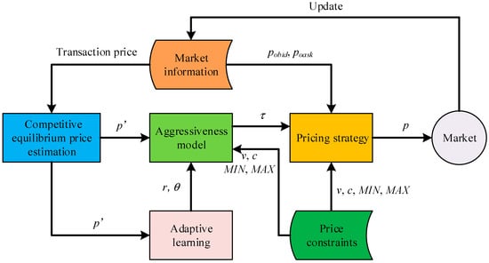 AA strategy is an adaptive learning quotation strategy (Figure 5) []. AA strategy is submitted to the market quotation through the competitive equilibrium price (CEP) estimation, aggressiveness model, and pricing strategy according to market information and price constraints. When the transaction is successful, the trading system updates the market information immediately.