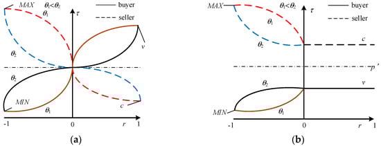 Aggressiveness degree r is a parameter that reflects the strength of aggressiveness. r is a real number in the range of [−1,1]. As r approaches to 1, the market participant has a strong will to win the bid. As r approaches to −1, the market subject is passive in bidding. If r = 0, the market subject keeps a neutral attitude toward the transaction. The relation curve between the target prices of intra-marginal and extra-marginal trading parties and aggressiveness degree is shown in Figure 6. Solid lines represent the buyer’s function, and the dashed lines represent the seller’s function. θ is a parameter that relates to market price volatility and determines the shape of the target price function.