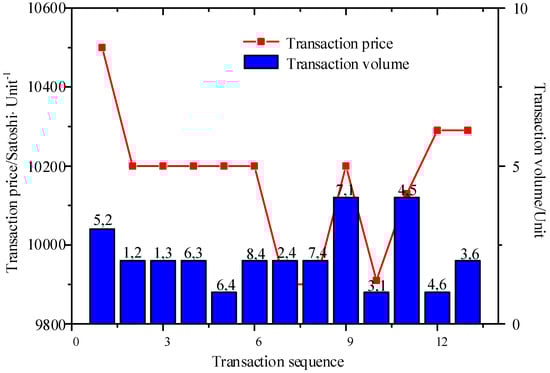Multiple transactions could occur in a round, as mentioned in Section 3. When the participants completed the match, they will stop trading if no remaining tradable power is available. Otherwise, the remaining electricity will enter the next round of trading. Thus, the relationship between the transaction round sequence and transaction sequence is obtained. The simulation results show that five rounds of transactions, including 13 transactions, are completed in the entire transaction period. The transaction and round sequences are (1–8, 1), (9, 2), (10, 3), (11–12, 4), and (13, 5). The variations of the transaction price and volume in a transaction period are shown in Figure 7, where Consumer 5 and DG 2, Consumer 1 and DG 2, Consumer 1 and DG 3, Consumer 6 and DG 3, Consumer 6 and DG 4, Consumer 8 and DG 4, Consumer 2 and DG 4, and Consumer 7 and DG 4 conclude the transactions (the numbers above the column represent the serial numbers of consumers and DG) in the first round. Their transaction volumes are 3, 2, 2, 2, 1, 2, 2, and 2 Units. These volumes are the collaborative result of the high quotes of the consumers and the low quotes of the DGs. The consumers are willing to offer a high price, whereas the DGs offer a low cost. Consumer 3 offers the lowest quote, and DG 6 offers the highest quote; thus, they conclude the transaction in the last round.