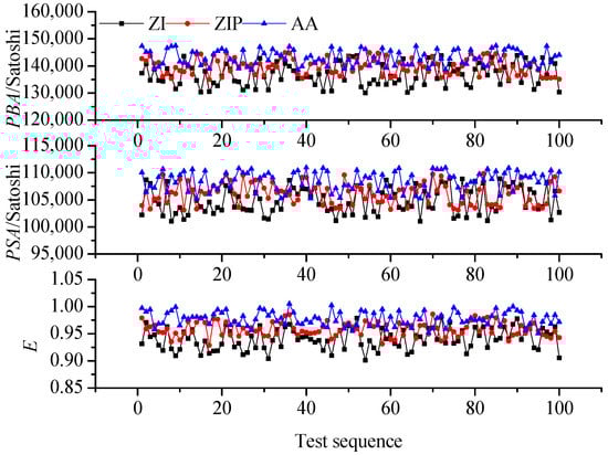 As shown in Figure 9, PBA, PSA, and E vary in different trading strategies. Although the market efficiency can still reach above 0.9, the profits of the buyer and seller are significantly lower in the ZI strategy than those of ZIP and AA strategies because ZI is a stochastic quotation strategy. The ZIP strategy introduces the price adjustment mechanism, which can track the change of market price and adjust the quotes to increase the profits compared with that of the ZI strategy, and the market efficiency is over 0.93. The AA strategy has the highest return and market efficiency (over 0.98) among the three strategies because the AA strategy quotation considers not only the current transaction price but also the market price fluctuations with significant adaptability. Obviously, the AA strategy is a suitable approach.