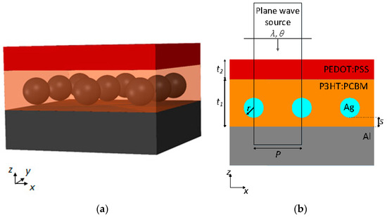A standard configuration of OPV with silver nanospheres is demonstrated in Figure 1. Ag nanospheres are assumed to have radius and are placed inside a poly(3-hexylthiophene):(6,6)-phenyl-C61-butyric-acid-methyl ester (P3HT:PCBM) layer of thickness at a vertical distance from the bottom and are repeated at a period of . The Ag-filled active layer is stacked by poly(3,4-ethylenedioxythiophene): poly(styrenesulfonate) (PEDOT:PSS) with thickness and an aluminum back reflector layer. The 3D view of the proposed OPV and the simplified 2D view are presented in Figure 1a,b. The problem is reduced from 3D to 2D based on the premises of the study by Moreno et al. [27]. In all the simulations of the present study, a plane wave source is propagated from the top to the bottom at a specified wavelength and at incident angle . Bloch and perfectly matched layer (PML) boundary conditions are imposed for and coordinates, respectively. Real and imaginary parts of the materials used in the simulations are taken from the literature [28,29,30].