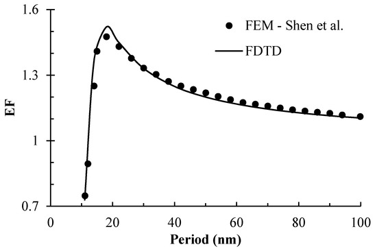 The absorbed fraction of optical power can be obtained by solving underlying physical equations, i.e., Maxwell’s electromagnetic equations. Maxwell’s equations are a set of partial differential equations which describe the relationship between electric and magnetic fields and incident light. Maxwell’s equations are generally solved numerically, except for a few simple cases where analytical solutions exist. One of the most popular methods for solving these equations is the Finite Difference Time Domain (FDTD) method which discretizes the spatial and temporal grid called Yee’s cell. In this study, a commercial software [32] provided by Lumerical Inc. (Vancouver, Canada) is used to facilitate FDTD simulations. EF is calculated for a photovoltaic cell structure in Figure 1 for , , , and for different . Computed EF values are compared with Finite Element Method (FEM) simulations by Shen et al. [30] in Figure 2.