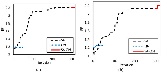 Evolution of EF during iterations of SA, QN and hybrid SA–QN for the initial guess (a) ; (b) .