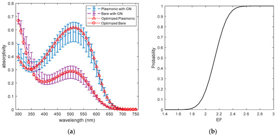 (a) Uncertainty of spectral absorptivity and EF to fabrication error modeled by Gaussian noise Spectral absorptivity when Gaussian noise is present with base absorptivity profiles for the geometry optimized by SA (left); (b) Cumulated distribution function of EF when Gaussian noise is present (right).