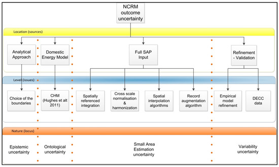 The formalization in a CM of the quantified parametric uncertainties in the NCRF outcome is presented in Figure 3. Figure 3 is an extension of a previous work published on the uncertainties of the CHM [19] (see [19] for the uncertainties in this source model). This paper uses the CHM uncertainty model as a starting point for an emerging spatial, area-based urban, domestic energy model of uncertainties. Figure 3 shows the CM section derived from [19] plus the additional CM sections describing uncertainty sources from NCRF: ‘Full SAP input’ and ‘refinement/validation’.