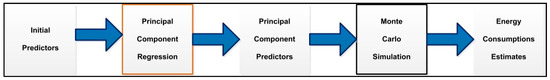 For the sensitivity analysis of the input variables, our paper uses, in Section 3 and Section 4, a framework which combines principal component regression and Monte Carlo Simulation Method. The principle of Monte Carlo Simulation is the propagation of the input (predictors) probability distributions through the model. This provides a general probabilistic basis for uncertainty evaluation in the energy estimation outcome. Monte Carlo Simulation is used as a method to study the uncertainty propagation through the model. This study uses a dimensional approach opposite to a categorical approach to synthesis [6]. The advantages of using our framework are to explore many combinations of energy predictors and analyze all possible outcomes for significantly more accurate results and to identify the factors with the most impact, i.e., identify the factors in the energy predictors with the greatest impact on energy consumption. Our framework, see Section 4.2, uses the gas consumption of bungalows in Castle, a particular district in Newcastle upon Tyne, a city in the north east of England. Our proposed framework is quite general. Thus, it can be presented as a ‘local energy model’ as an applicative example.