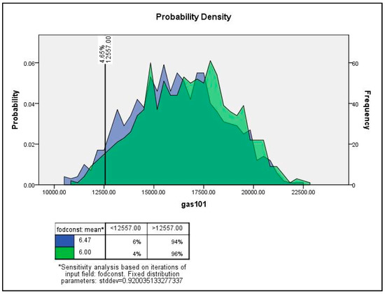 The black line on the top dark yellow graph is the probability density function (PDF) of the annual heating gas consumption (gas101) of the Castle bungalows. The PDF describes the relative likelihood for this random variable to take on the DECC median value. The horizontal axis shows the values of the annual heating gas consumption and the vertical axis shows the probability (on the left) and the relative frequency of occurrence (on the right). The likelihood (probability) of a new bungalow in Castle to have annual energy consumption less than 12,557 kWh (the DECC medium value) is the integral of the probability density function (is 0.0561 or 5.61%) up to 12,557 kWh. Other information in Figure 5 include: the probability of having an NCRF bungalow with a consumption less than 10,000 kWh is cero and the probability of having a bungalow with a consumption less than 22,000 kWh is almost one (100%).