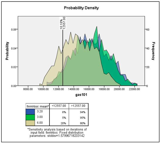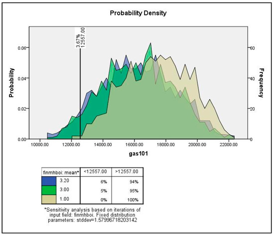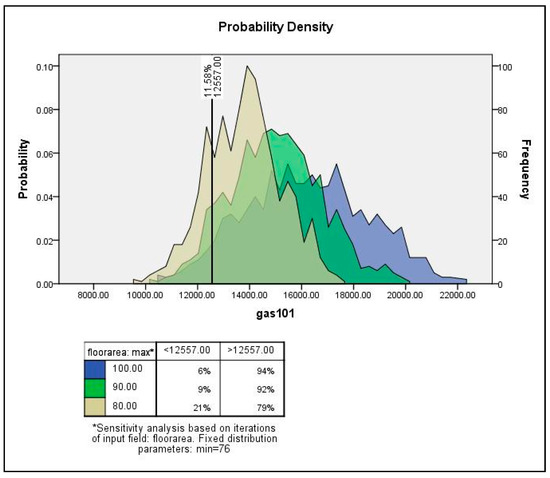 Figure 5 shows the base line scenario analysis results for the probability of a new bungalow dwelling matching the median DECC value (see step vi in the roadmap above in this section). Figure 5 shows the likelihood (5.61%) of making the DECC median value in the Monte Carlo base line. The Statistical Package for the Social Sciences (SPSS) was used to create the probabilities density functions in this section and the output shows the NCRF estimates on the x axis. A peculiarity of SPSS is that it provides y axes showing the probability on the left and the frequency on the right. However, the shape of the curve and its position relative to the median DECC value is the key aspect of Figure 5.