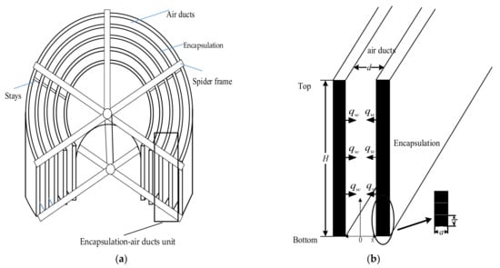 where, in the right-hand side of the equation, the first term is the average fluid temperature rise, and the second term is the fluid-solid temperature difference. Tmax is the maximum temperature rise of encapsulation, qw is the heat flux conducted from the encapsulation surface to air ducts, H is the height of the encapsulation, d is the width of the air ducts, is the average velocity of the fluid, ρ is the fluid density, and Cp is the specific heat at constant pressure. λ is the heat conductivity coefficient of the fluid, and Nu is the Nusselt number in the air ducts.
