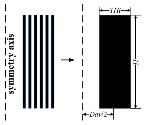 The thermal efficiency optimization goal is to achieve the minimum metal conductor usage, and the constraint condition is the maximum temperature rise conservation. Considering the heat and heat dissipation conditions of the inner encapsulations are basically the same, based on the equal height and heat flux design method, the encapsulation-air ducts unit, which is comprised of two encapsulations and an air duct, can be taken as the research object to compute the maximum temperature rise of the coils. For a large-type air core reactor, the diameter of the encapsulation is larger than the air duct width, so the unit can be considered equivalent to a vertical tube tank model, as shown in Figure 1.