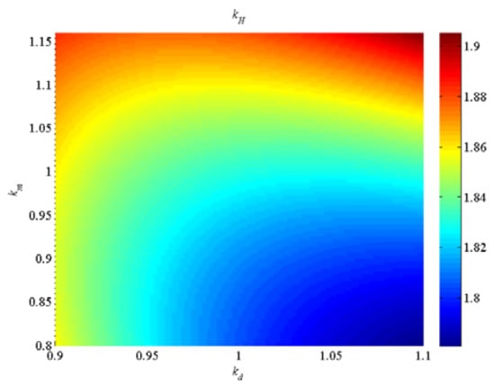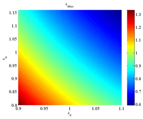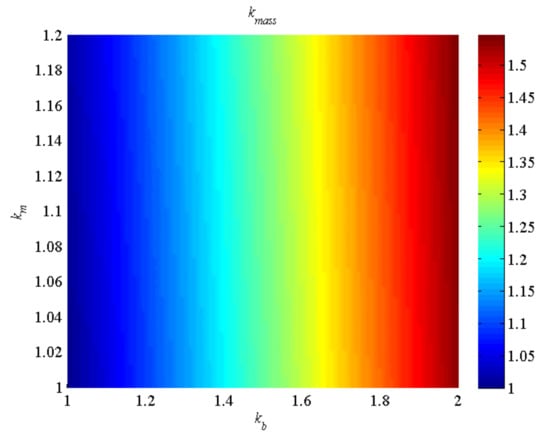 From Equation (31), kMass is decided by two independent variables kd and km, thus, for a given range of kd and km, the optimization curve considering the change of the air duct width and encapsulation number can be plotted.