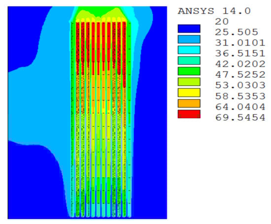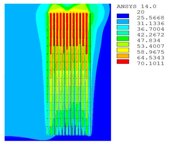 Figure 14 shows the temperature field simulation results based on the design results in Method 2, where the maximum temperature rise is 49.5 °C: Figure 15 shows the temperature field simulation results based on the design results in Method 3, where the maximum temperature rise is 50.1 °C. They only show a 3.1% and 4.4% difference compared with the maximum temperature rise of the initial parameters. Meanwhile, the temperature distribution of the inner encapsulation is basically the same. Thus, the simulation results verify the correctness of the comprehensive optimization method.
