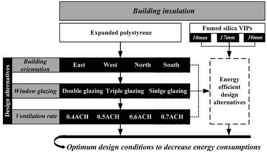 Fumed silica is composed of silicon carbide normally with fibers for structural stability inside the pores and is the most commonly used core-material for VIPs today [24]. In addition, silica is nontoxic, incombustible, and recyclable and the core of fumed silica has an important role in absorbing water vapor permeating through the envelope [24]. Due to low thermal conductivity of around 0.004 W/m−1K−1, fumes silica can reduce the heat transfer by radiation and energy consumptions if they are properly installed [22,24,32]. However, little information is available on building thermal and energy performance of building envelopes with fumed VIPs. Thus, the current paper discusses thermal insulation performance of fumed silica VIPs in combination with other building elements and conditions, namely building orientation, building infiltration rates, building glazing type and insulation thickness.