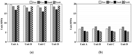 The building in the current study contains four units in an apartment building: Units A–D. In Units A and D, three facades of their envelopes were exposed to the outdoor weather condition. For Units B and C, only two façades of the building envelopes were in contact with the outdoor environment. Figure 3 shows the heating and cooling loads through four building orientations. For the heating load, the energy usage of Unit D was the biggest and the lowest energy consumption was observed in Unit C. On the other hand, the largest and the lowest cooling loads occurred in Units B and A, respectively. For energy consumed by the orientation, the heating loads were the lowest when the building is oriented to the south. In addition, the lowest cooling loads were observed in the north facing building. The difference between the heating and cooling loads was larger than the difference in energy consumptions among units (18 to 18.7 MWh for heating and 6.4 to 6.6 MWh for cooling). It can be seen that the south orientation is the best option among other orientations.