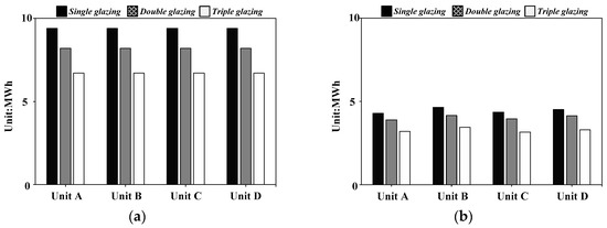 The effect of window glazing on building energy consumptions. (a) Heating loads; (b) Cooling loads.