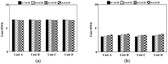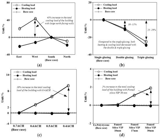 Considering the best conditions as indicated above, Figure 7 shows the comparison analyses of the heating and cooling loads in Unit B. As can be seen, 43% of cooling energy was additionally used when the building was oriented to the west. In addition, the largest reduction in the heating and cooling was observed when the triple pane window system was equipped in the building. Unlike Figure 8a,b, Figure 8c,d shows relatively small changes in the heating and cooling loads, where the best conditions were applied. The total energy consumptions can be reduced when the infiltration rates were increased. In addition, the thick fumed silica VIP required more cooling energy than that of other fumed silica VIPs of 10 mm and 17 mm. However, the total energy consumptions among three fumed silica VIPs showed a slight difference and it can be seen that the use of fumed silica VIPs can reduce the energy use for heating and cooling.