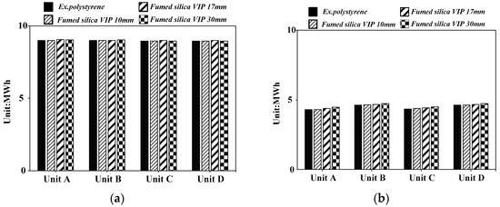 As indicated in Figure 6, there is little difference in the heating loads between the expanded polystyrene and the fumed silica VIP 10 mm. The heating loads were decreased as the thickness of fumed silica VIPs was increased, whereas the cooling loads were increased with an increase of the fumed silica VIPs’ thickness.