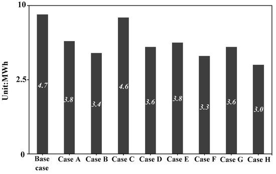 Design alternatives were applied to a reference apartment building and the energy consumption of each design variable was investigated using IES-VE. Considering the results of the comparisons in Section 4.1, Section 4.2, Section 4.3 and Section 4.4, the optimum design condition was explored based on combinations of design options. Eight combinations including the base case are presented in Table 5. Expanded polystyrene insulation material was used for Cases A and B and two different thicknesses of fumed silica VIPs were applied in Cases C–H. In addition, Cases A–F, for annual heating loads, and Cases A–H, for annual cooling loads, were investigated. In addition, an external shading device was applied in Cases G and H.