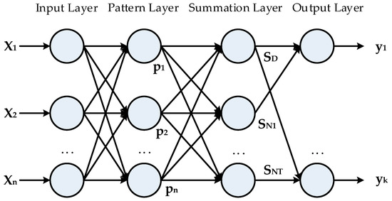 - pattern layer. The number of neurons is equal to the number of learning samples. Each neuron corresponds to a different sample, and the neuron transfer function is:where represents the network input variable, is the corresponding learning sample of neuron , and belongs to the width coefficient of the Gaussian function, which is called the smoothing factor.