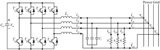 Circuit scheme of three-phase four-leg inverter-based shunt APF in grid-connected operation.