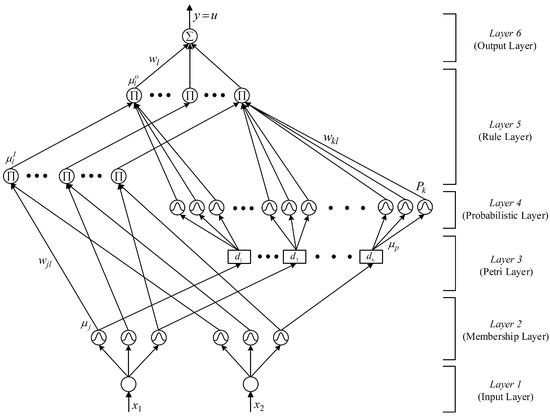 The network structure of the proposed PPFNN shown in Figure 3 has six layers including the input layer (layer 1), the membership layer (layer 2), the Petri layer (layer 3), the probabilistic layer (layer 4), the rule layer (layer 5) and the output layer (layer 6). Moreover, there are two inputs and one output. The signal propagation of each layer is described in the following: