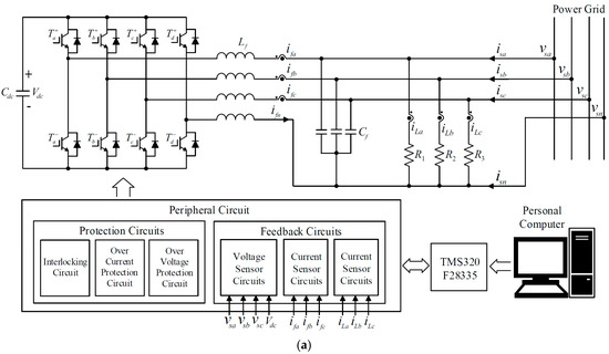 The power pollution in power systems, which results from rectifiers, arc furnaces, nonlinear loads and switching power supplies, has been gained wide attention in recent years [1,2]. Moreover, owing to the increasing usage of power electronic equipment, the power quality in the distribution system is seriously deteriorated. Not only the voltage and current could not be operated within reasonable values, but the resulting non-sinusoidal currents could also cause voltage distortion on the load side. On the other hand, the deterioration of the power quality can be compensated effectively by using power electronic technologies [3,4]. The active power filter (APF) is one of the powerful tools used to compensate the load harmonics, unbalanced load currents and reactive power and has recently been widely adopted to improve the power quality [5,6,7]. APFs can be classified into series, shunt and hybrid APFs three categories [8,9]. A series APF is connected with the power grid in series and is effective to generate harmonic voltages to compensate load harmonic voltages [10]. Furthermore, the series APF is usually employed to protect sensitive loads in polluted grid scenarios. A series APF for the compensation of harmonics and reactive power generated by the non-linear loads was proposed in [11]. In [12], at the point of common coupling, a series APF based on a single-phase matrix converter was adopted to protect sensitive loads from the effects of voltage disturbances. However, the complexity of installation in practical applications limits the use of the series APF [13]. In addition, the hybrid APF is formed by an APF and a passive filter. In [14], a hybrid APF, which is composed of a series APF and a shunt-connected passive filter, was adopted to improve the power quality. Due to the complicated structure, the hybrid APF is still too complicated for practical applications [13]. On the other hand, a shunt APF is usually employed to compensate the harmonics introduced by non-linear loads connected to the power grid [12]. In order to compensate load harmonic currents, a shunt APF is directly connected with the power grid and loads in parallel, and is used to generate harmonic currents [10]. Owing to the simplified structure, the shunt APF has become the most widely employed type [10,15,16,17]. In [15], an adaptive hysteresis and fuzzy logic control-based three-phase four-leg interleaved buck APF was proposed to eliminate current harmonics and compensate the unbalanced load currents. In [16], a nonlinear control algorithm of the shunt APF was proposed to enhance the response for compensating the load currents. An APF using the synchronous reference frame and indirect current control strategy for improving the power quality under the unbalanced and distorted system conditions was proposed in [17]. Additionally, the power circuits for APFs can be classified into two types: voltage source converters with DC capacitor and current source converters with DC inductor [18]. Since a free-wheeling diode is connected in anti-parallel with each IGBT, the IGBT module is more suitable for the voltage source converter with DC capacitor. This means that the IGBT doesn’t need to provide the ability of reverse-blocking in itself. Hence, the IGBT possesses more flexibility for device design in a compromise among switching losses, conducting losses and short circuit ability than the reverse-blocking IGBT. On the other hand, a reverse-blocking diode is connected in series with each IGBT to construct the current source converter with DC inductor. The reverse-blocking IGBT leads to worse device characteristics and more complicated fabrication and device design than the traditional IGBT without reverse-blocking ability. Therefore, compared with the current source converter with DC inductor, the voltage source converter with DC capacitor possesses the advantages of small size, low cost, and high efficiency [18]. Moreover, since the control algorithm of the APF will cause a large amount of apparent power, which includes the active power for the losses and reactive power for the capacitor, flowing into or out of the APF, a DC-link capacitor is required on the DC side of the APF to release or absorb the apparent power [19,20]. Therefore, the regulation control of the DC-link voltage of the APF is important especially at the load variation condition. However, traditional proportional-integral (PI) controller has been adopted for the DC-link voltage regulation control only resulted in sluggish responses [19,20].