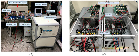 DSP-based shunt APF: (a) Block diagram of three-phase four-leg inverter-based shunt APF; (b) Photos of DSP-based control platform, unbalanced loads and inverter; and (c) Photo of three-phase four-leg inverter.