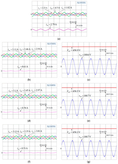 Experimental results at unbalanced load 3: (a) Responses of three-phase currents isa, isb, isc and neutral current isn without using shunt APF; (b) Responses of three-phase currents isa, isb, isc and neutral current isn using PI controlled shunt APF; (c) Responses of DC-link voltage Vdc and phase voltage of power grid vsa using PI controlled shunt APF; (d) Responses of three-phase currents isa, isb, isc and neutral current isn using PFNN controlled shunt APF; (e) Responses of DC-link voltage Vdc and phase voltage of power grid vsa using PFNN controlled shunt APF; (f) Responses of three-phase currents isa, isb, isc and neutral current isn using proposed PPFNN controlled shunt APF; and (g) Responses of DC-link voltage Vdc and phase voltage of power grid vsa using proposed PPFNN controlled shunt APF.