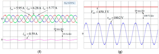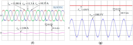 Experimental results at unbalanced load 2: (a) Responses of three-phase currents isa, isb, isc and neutral current isn without using shunt APF; (b) Responses of three-phase currents isa, isb, isc and neutral current isn using PI controlled shunt APF; (c) Responses of DC-link voltage Vdc and phase voltage of power grid vsa using PI controlled shunt APF; (d) Responses of three-phase currents isa, isb, isc and neutral current isn using PFNN controlled shunt APF; (e) Responses of DC-link voltage Vdc and phase voltage of power grid vsa using PFNN controlled shunt APF; (f) Responses of three-phase currents isa, isb, isc and neutral current isn using proposed PPFNN controlled shunt APF; and (g) Responses of DC-link voltage Vdc and phase voltage of power grid vsa using proposed PPFNN controlled shunt APF.