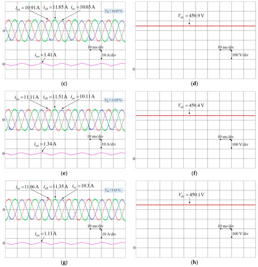To further verify the feasibility and the effectiveness of the proposed PPFNN controlled APF with system uncertainties, a two-phase to ground fault with 0.2 per unit (pu) voltage dip on the power grid is considered at the unbalanced load 3. The experimental results without using the shunt APF and the experimental results using PI, PFNN and the proposed PPFNN controlled shunt APFs at the unbalanced load 3 under abnormal grid voltage are provided in Figure 8. First, the responses of the amplitude of grid voltage with 0.2 pu voltage dip is shown in Figure 8a. Then, the responses of three-phase currents isa, isb, isc and neutral current isn without using shunt APF are provided in Figure 8b. The three-phase unbalanced current ratio UR without using the shunt APF is 133.5% and the peak value of the neutral current isn is 9.66 A. Furthermore, the responses of the three-phase currents isa, isb, isc and neutral current isn and DC-link voltage Vdc using PI controlled shunt APF are shown in Figure 8c,d; the responses of the three-phase currents isa, isb, isc and neutral current isn and DC-link voltage Vdc using PFNN controlled shunt APF are shown in Figure 8e,f; the responses of the three-phase currents isa, isb, isc and neutral current isn and DC-link voltage Vdc using the proposed PPFNN controlled shunt APF are shown in Figure 8g,h. From the experimental results, the PI, PFNN and the proposed PPFNN controlled shunt APFs can make the three-phase currents isa, isb, isc of the power grid be balanced, and the peak value of the neutral current isn using PI, PFNN and the proposed PPFNN controlled shunt APF can be suppressed to be 1.41 A, 1.34 A and 1.11 A as shown in Figure 8c,e,g. In addition, the unbalanced current ratio UR using PI, PFNN and the proposed PPFNN controlled shunt APFs at the unbalanced load 3 under abnormal grid voltage are 16.65%, 12.83% and 9.63%, respectively. From the experimental results, though the shunt APF is operated under abnormal grid voltage, the compensation performance of the proposed PPFNN controlled shunt APF is still superior than the PI and PFNN controlled shunt APFs.